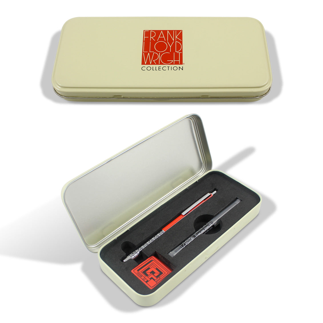 "FLW Architect's" Pencil is inspired by Frank Lloyd Wright. The barrel is lacquered in Mr. Wright's favorite color, Cherokee Red with his signature in black. The grip is done in chrome and has an engraved design on it based on a textile block from the Ennis House. The pencil is presented in an ACME metal box which includes an eraser and a tube of leads, with a black sleeve and ACME literature.