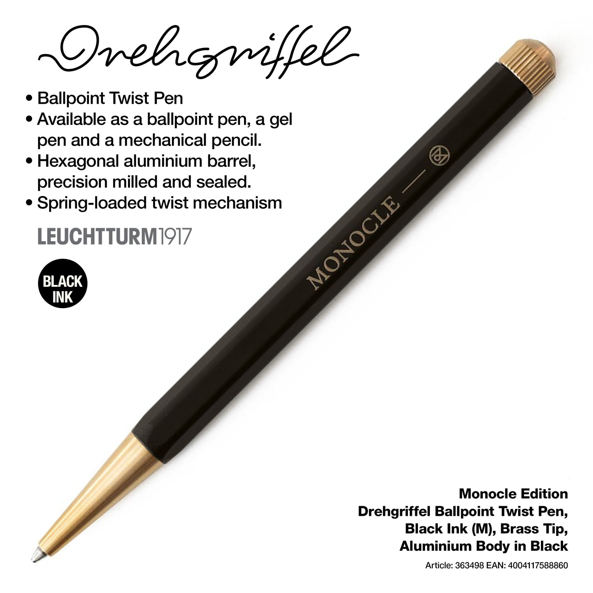 - The Leuchtturm1917 “Drehgriffel” Twist Pen is precision-milled from aluminium and brass, then varnished and sealed. It has a spring-loaded twist mechanism and is available as a ballpoint pen, a gel pen and a mechanical pencil.