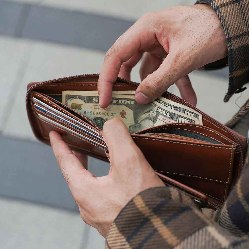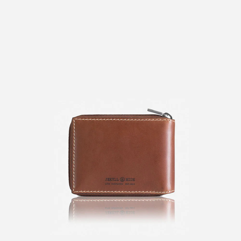 A large zip mens leather wallet that opens to reveal a range of compartments, giving you space for it all, from cards and coins to cash. Our minimally treated, vegetable-tanned leather is crafted to patina over time, ensuring it develops a look that is uniquely yours.