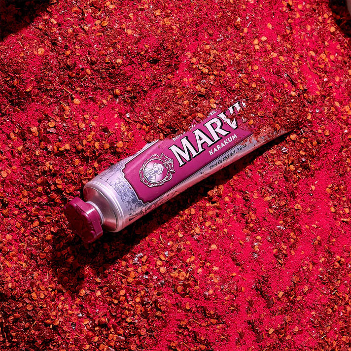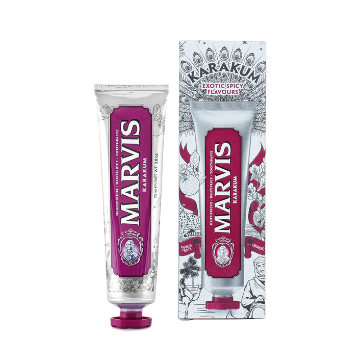 Marvis's Karakum Toothpaste takes inspiration from travels across the Black Sea to Persia and exotic Eastern China. A toothpaste with a sophisticated flavour that combines the finest peppermint with the sweetness of orange juice along with the enchanting and aromatic cardamom, a rare oriental spice to create a lasting sensation of alluring freshness. The creamy formulation combines peppermint with the sweetness of orange juice and aromatic cardamom.