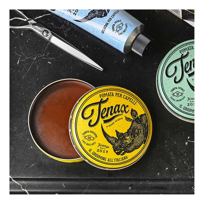 Tenax Pomade - Extra Strong Hold is a water-based wax that guarantees a firm hold. Its composition makes your hair shiny, bright and firm, but soft at the same time. You can apply Tenax through dry or damp hair. It is easy to wash off. Fix your hairstyle: the perfect choice for a solid but not static hair styling. The take anywhere tin easily fits into a wet pack/beauty bag. Made in Florence, Italy. 125gm