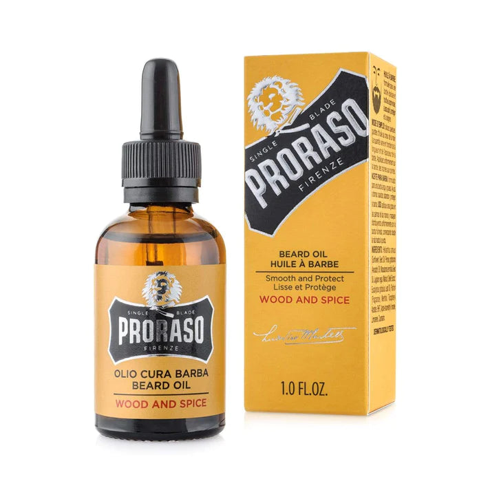 Proraso’s Wood & Spice Beard Oil is formulated to tame, smooth, nourish and protect a long, thick beard. Omega-3 and Omega-6 rich Walnut Oil and Sunflower Oil work to moisturise and condition beard hair. Avocado and Macadamia Nut Oils give extra protection while helping to soften and add a lasting sheen. Proraso’s classic, masculine Wood and Spice fragrance features the enveloping warmth of fine woods, with a cedar heart and notes of rock rose. The spicy scent of cumin and saffron mix with mildly sweet vanilla. An intense and rewarding aromatic sensation gives the feeling of comfort and ease. To use simply add a few drops to to palms of your hands and rub through the beard hair starting from the roots to the tip of beard. Made in Italy. 30ml
