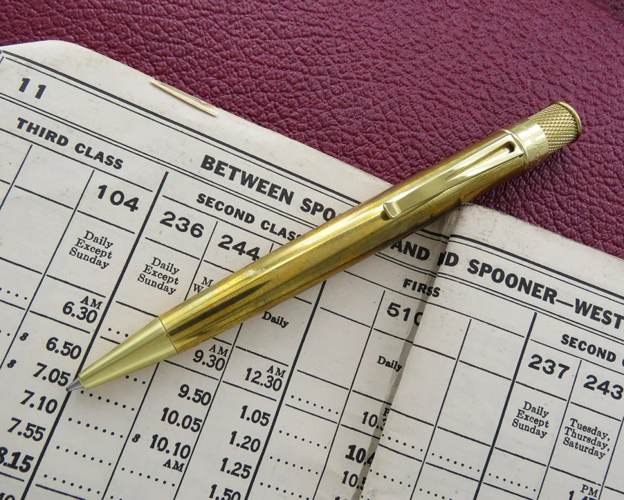 The Raw Brass rollerball pen is a heavy metal pen that will age well with use. This all-brass construction has been well polished and does not have a protective coating, so it ages with the owner's use and becomes a one-of-a-kind heirloom piece. It's topped with a green top disc and comes in a Retro graphic tube.