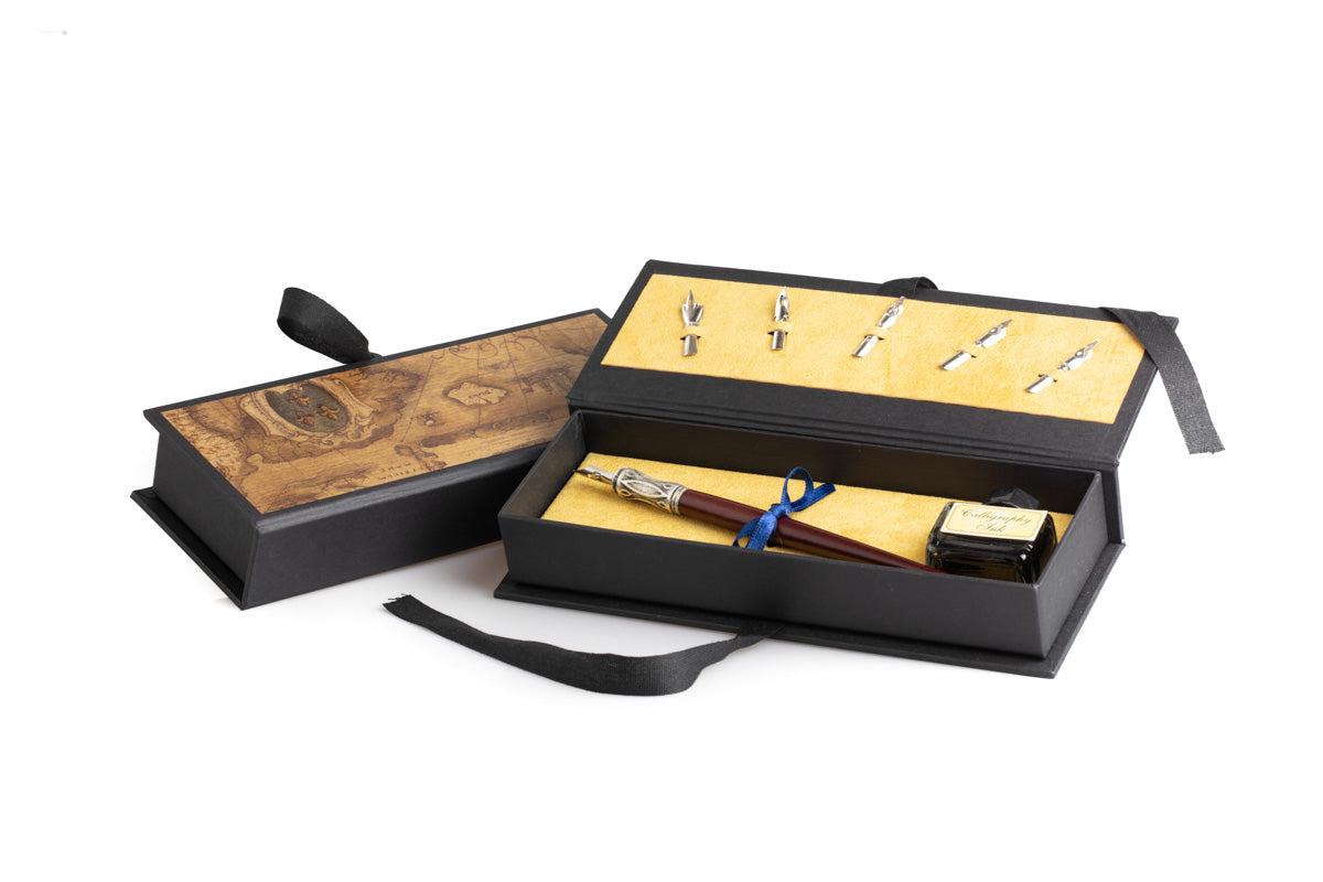Writing set with wooden pen, decorated metal tip and calligraphic ink in a luxury handmade package