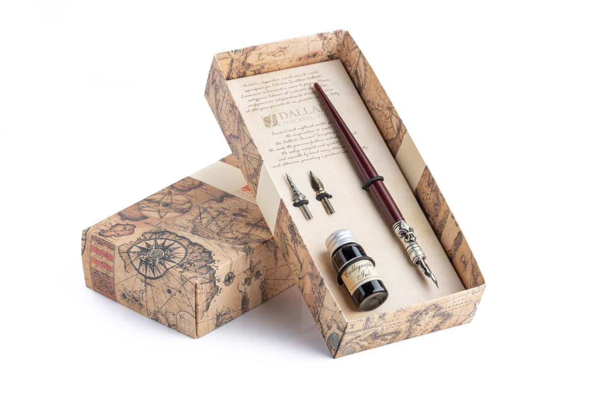 The package comes with a black glass bottle of calligraphy ink 10ml and 2 gold replacement nibs.