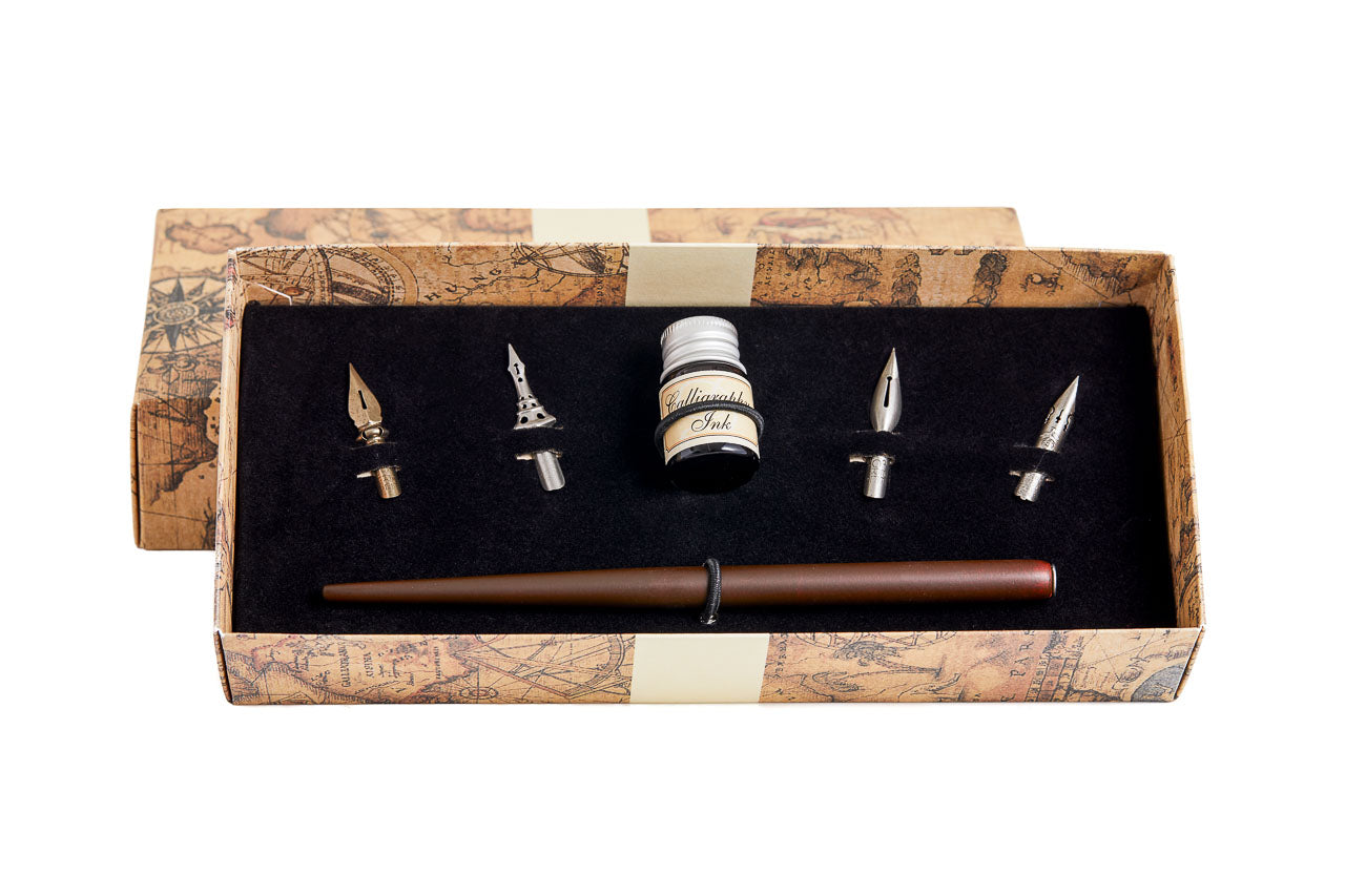 The package is equipped with an 18ml calligraphic glass ink bottle with 4 nibs.