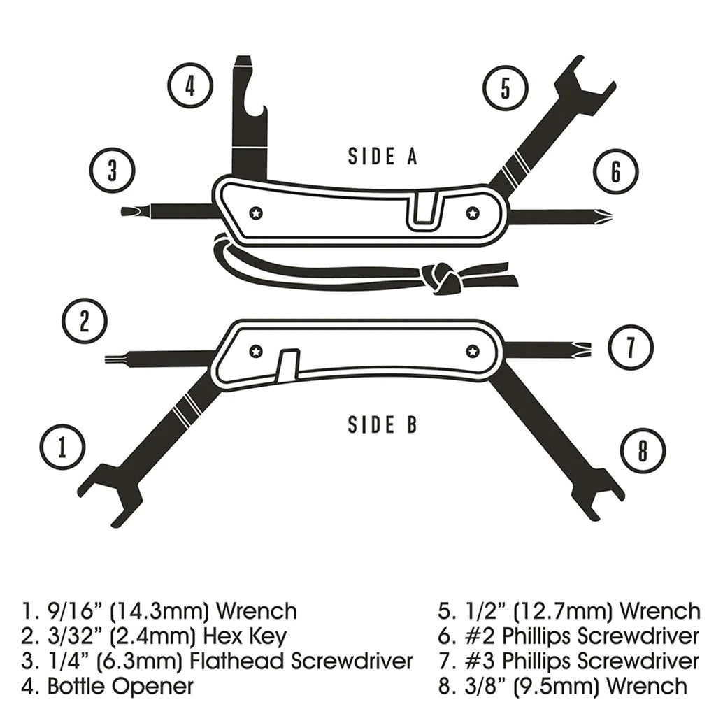 • Tool includes 3 wrenches, 2 Phillips screwdrivers, a Hex Key, Flat Head Screwdriver and Bottle Opener