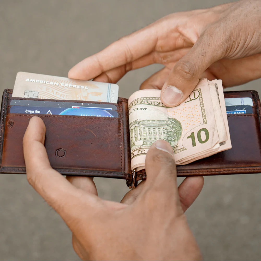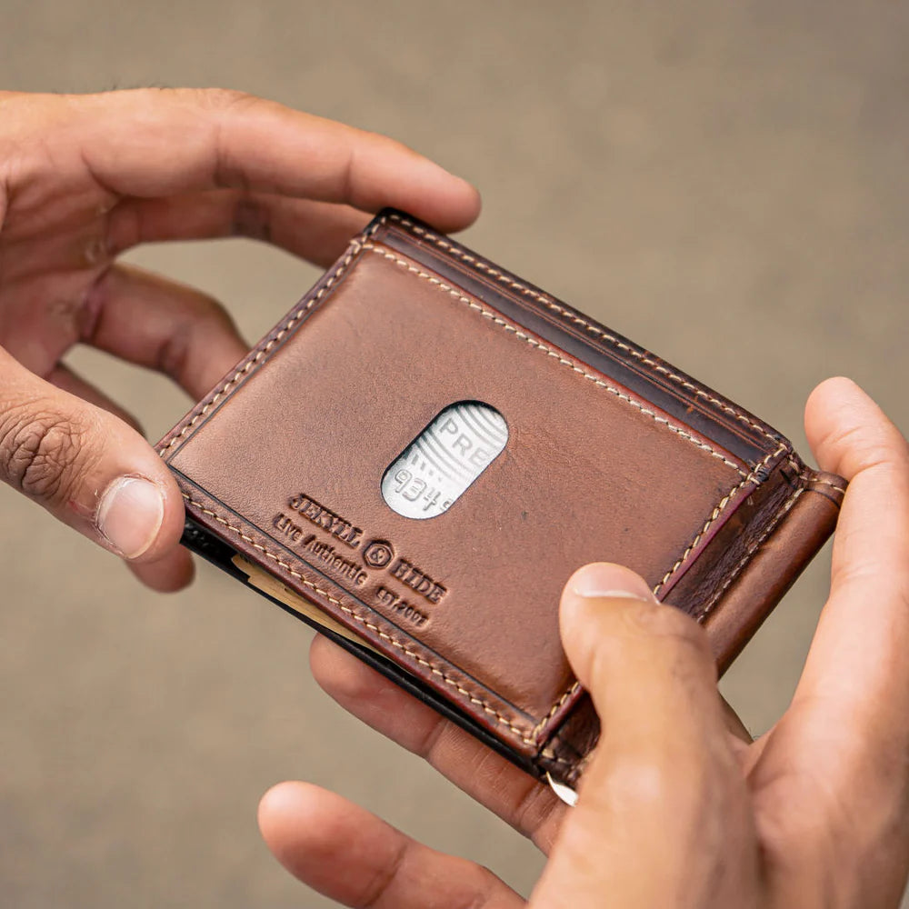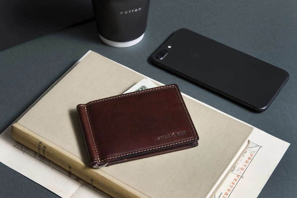 A classic money clip wallet for the modern world, this striking leather wallet holds all your items and comes with a metal money strap for easy access to notes. Our minimally treated, vegetable-tanned leather is crafted to patina over time, ensuring it develops a look that is uniquely yours.